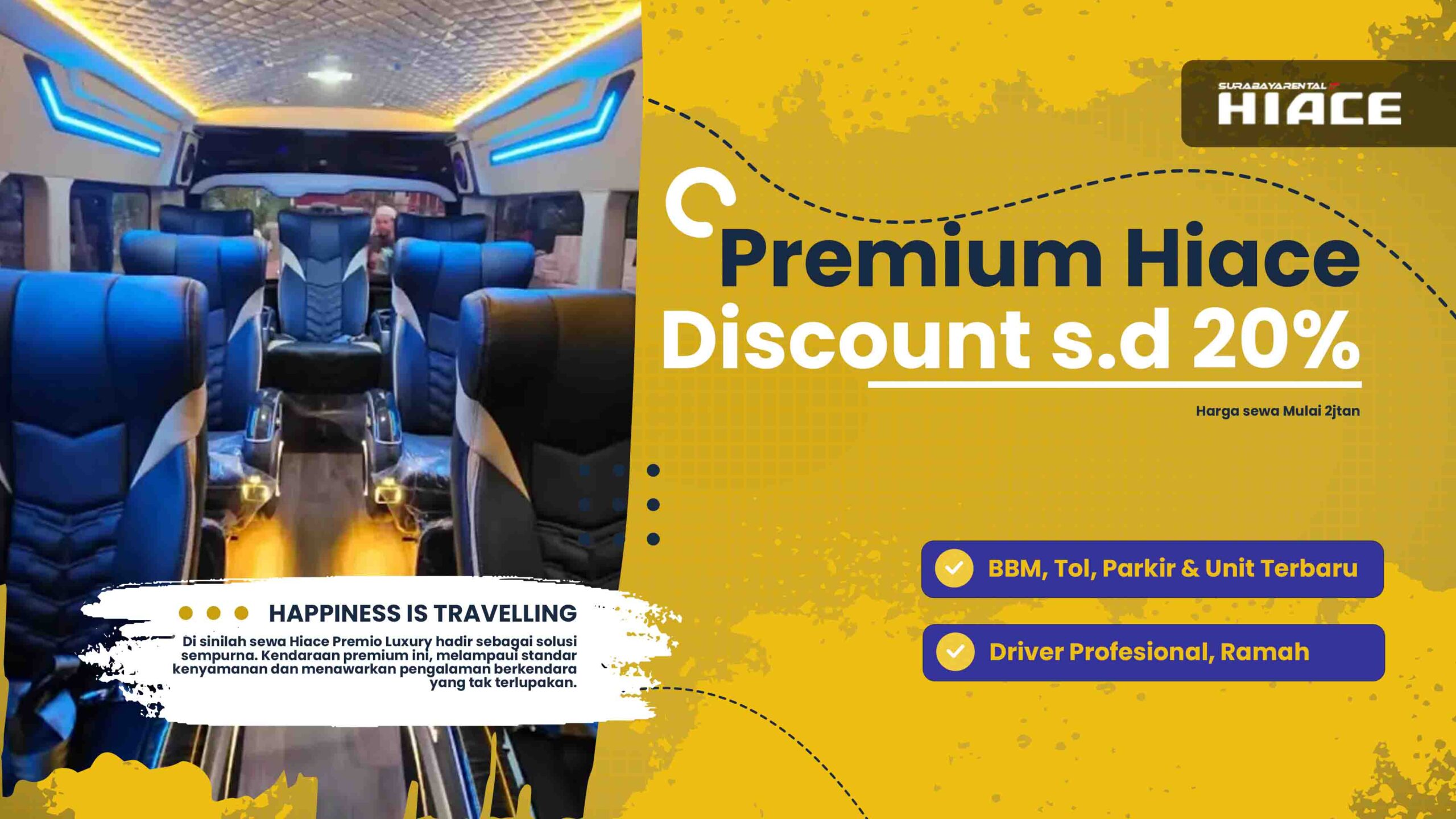 Surabayarentalhiace.com menyediakan solusi transportasi untuk Sewa Hiace Luxury, Hiace Premio, Hiace Premio Luxury, Rental Hiace. Sebagai penyedia jasa rental hiace terlengkap di Surabaya, Kami terus berinovasi dan memberikan pelayanan prima. Dengan standar pelayanan tersertifikasi serta mampu memastikan kenyamanan dan keamanan perjalanan Anda.